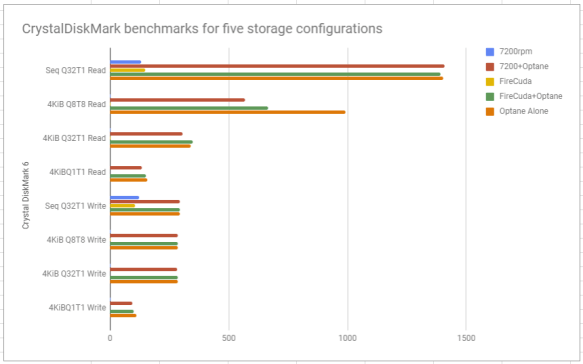 Unsurprisingly, CPU, RAM, and GPU tests didn’t show a distinction between the four storage options. Also unsurprisingly, disk performance with Optane was much better than without. I was a bit surprised that unaccelerated writes were better on the standard 7200rpm disk compared to FireCuda.