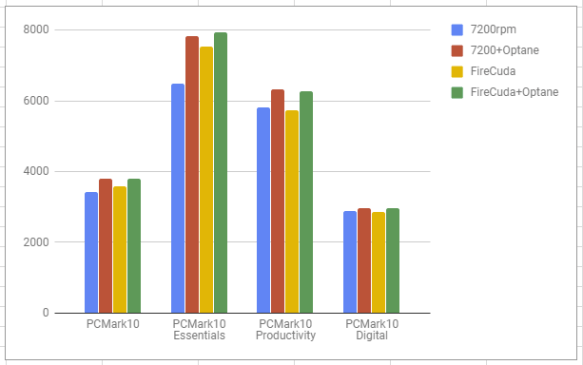 NovaBench (graph above) showed 2-4x better writes with Optane, and 7-9x better reads, roughly speaking. PCMark10 (graph below) had less shocking results, but Optane improved the 7200rpm disk by 20% on “Essentials,” but only 3% on Digital Content Creation. With FireCuda, Optane only improved Essentials by 5% or so, and the other two tests were similar to the 7200rpm tests