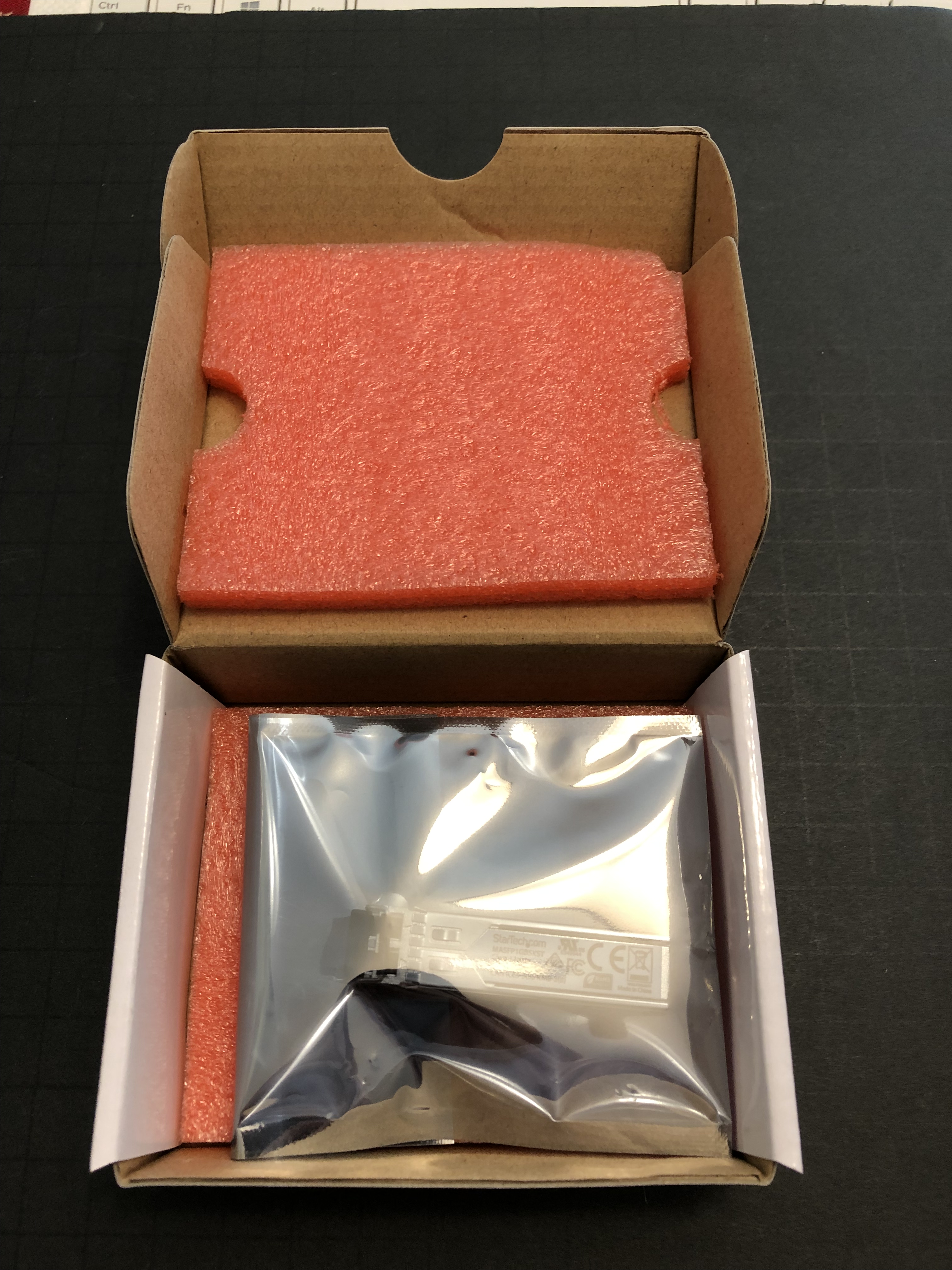 2018-12-01 14.01.01 Published December 8, 2018 at 3024 × 4032 in Test-driving third party optics from StarTech in the RSTS11 labs StarTech optical module, in anti-static bag padded with foam