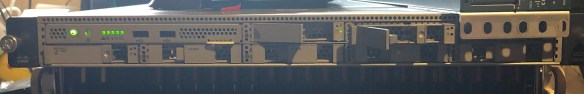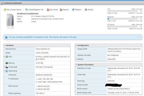This is a standalone system, even though it’s sitting underneath a UCS 6296 Fabric Interconnect that’s freshly updated as well. I have the two on-board Gigabit Ethernet ports as well as a 4-port Gigabit Ethernet add-on card. And by way of disclosure, while I do work for Cisco and probably could have gotten a better box through work, I bought this one in a local auction out of my own pocket.
