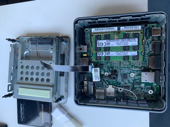 Base computer – NUC10i7FNH1 currently $570 at Amazon. You want the i7, and you want the FNH which is the “high” case that holds a 2.5″ drive as well as the m.2.
