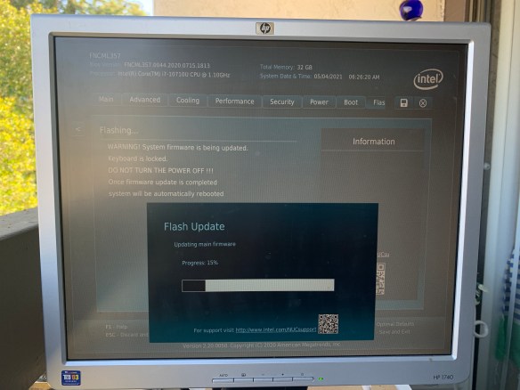 You’ll also need a USB drive to install Ubuntu 20.04 from, and while you’re at it, download the latest BIOS update (FNCML357 as of this writing) from the Intel Download Center. Drop it on a flash drive, and once you have the kit assembled, you can use the boot menu to flash the BIOS before installing your OS.