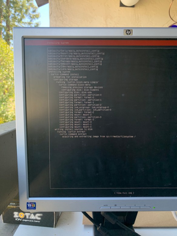 I’ll admit the newer Ubuntu flow confused me a bit, especially with the “curtin” spinner continuing after the system was done installing. But when that “Installing system” message at the top turns to “Installation Complete” or something like that, you can tab down to the reboot option and reboot your new server.