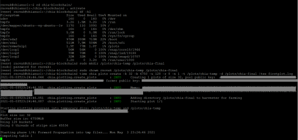 time chia plots create -k 32 -b 6750 -u 128 -r 8 -n 1 -t /plots/chia-temp -d /plots/chia-final |tee firstplot.log