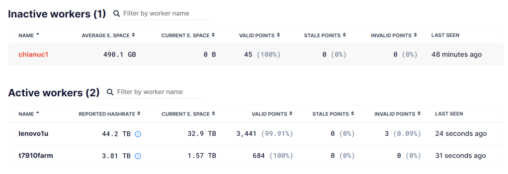 From this screen, I see that ‘chianuc1’ (which is a lot easier to remember than “c1dec8”) hasn’t been heard from lately. I go to look at it and see that it only supplies 6 plots, which is 60 points per day. Divide 1440 (minutes per day) by 60 (points per day) and I see on average I’ll get one point/partial every 24 minutes. With Flexpool’s 20 minute timeout, I will be “offline” a lot of the time until I get up to more plots.