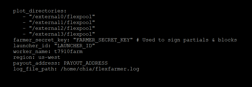 You download and install a binary called ‘FlexFarmer’ on your system, use a python script to get your farmer private key (used for validating partials and signing new blocks), and configure the farmer with a YAML file (above) with details like your farmer private key, your payout address, a system name (much better than the hexadecimal defaults), and where FlexFarmer should look for its plots.
