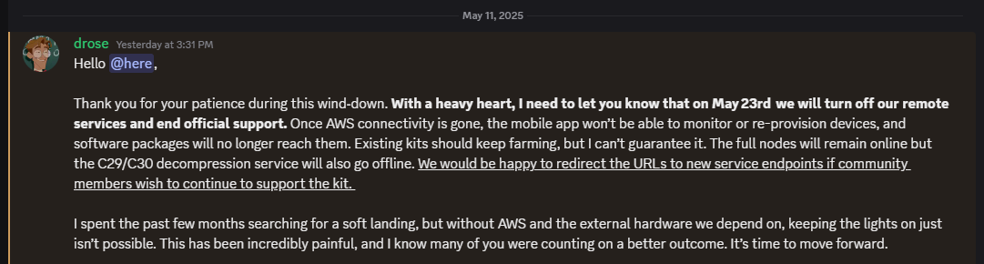 In the last six months, though, support responsiveness has been low, visibility of the leadership team has been mostly non-existent, and a lot of farmers have been stuck in extremely high latency support ticket loops. As I finish up this post on Saturday afternoon (March 8, 2025), it’s been over a week since either of the visible members of the Evergreen team have posted anything on Discord.