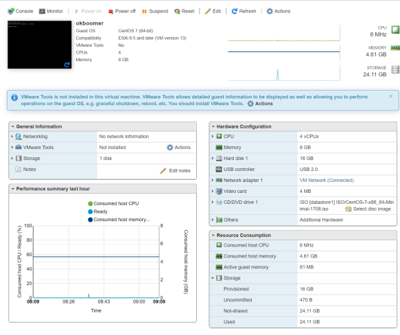 I burned the 344 MB ISO to a flash drive, finding again that Etcher didn’t like it (complaining not being a bootable ISO) but Rufus did. With a Rufus-burned 8GB drive (choose “yes” to replace menu.c32 by the way), I was able to install the vSphere system and bring it up.