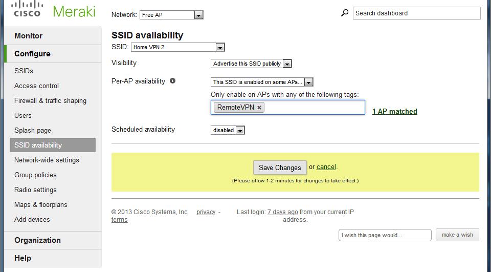 Now the VPN SSID will only show up on the APs you’ve tagged as RemoteVPN, and not on your HQ APs.